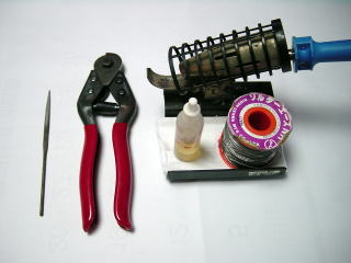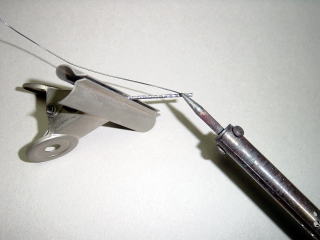![]() 4,金属製のクリップ等でワイヤーを固定し,ニードルに 差し込まれる部分だけ半田を流し込む。 これによりワイヤーがバラけることなく 固定用イモネジがしっかりと効きます。 |